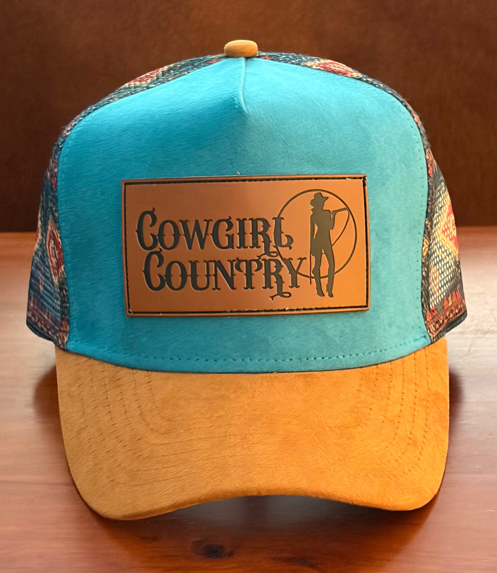 Featuring a genuine suede front and brim paired with a real leather Cowgirl Country badge, this cap delivers a premium look and feel. The Aztec mesh back adds breathability and that unmistakable Western detail.
